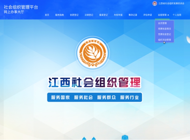 进入江西省民政厅官网,在博彩网站导航“网上办事大厅”栏目点击“江西社会组织”,登录“江西社会组织管理”系统(用户名为统一社会信用代码),选择菜单栏中“年检年报”业务,填写2025年度工作报告书。